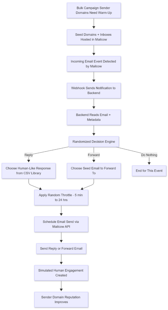 We built a Human Engagement Simulation System that automatically sends realistic, delayed, and varied responses between seed email accounts. This creates organic engagement patterns that warm up sender domains and improve deliverability for bulk campaigns.