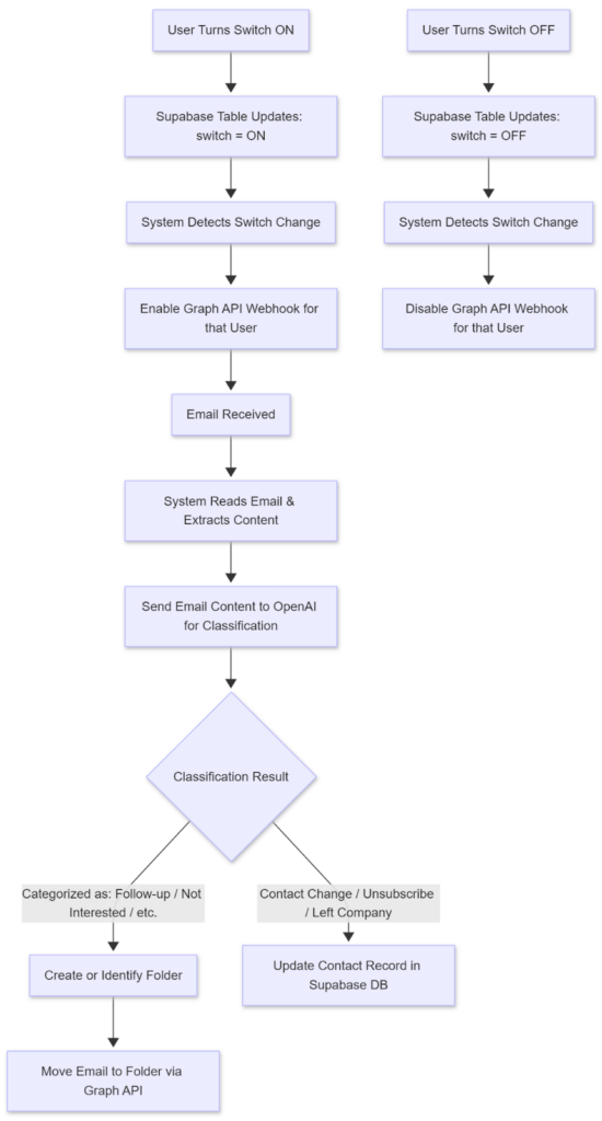 The solution integrates AI classification, email webhooks, Supabase database operations, and a user-controlled enable/disable switch built into the main application.