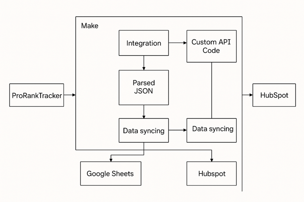We developed a robust, automated integration between ProRankTracker, Make (Integromat), Google Sheets, and HubSpot. The solution fetches ranking data via custom API calls, parses and loops through paginated responses, and updates or creates custom records in HubSpot. The flow was optimized for API limits and execution time constraints by batching, modularizing flows, and introducing sleep/delay mechanisms.