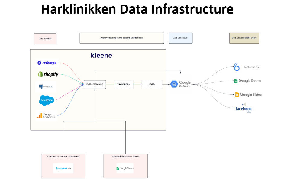 Client’s company needed to scale and centralize its analytics infrastructure across 7 clinics and multiple departments. They were grappling with siloed datasets, unoptimized dashboards, fragmented marketing and customer insights, and inconsistent data pipelines affecting decision-making and operational visibility.