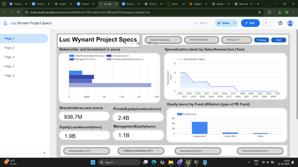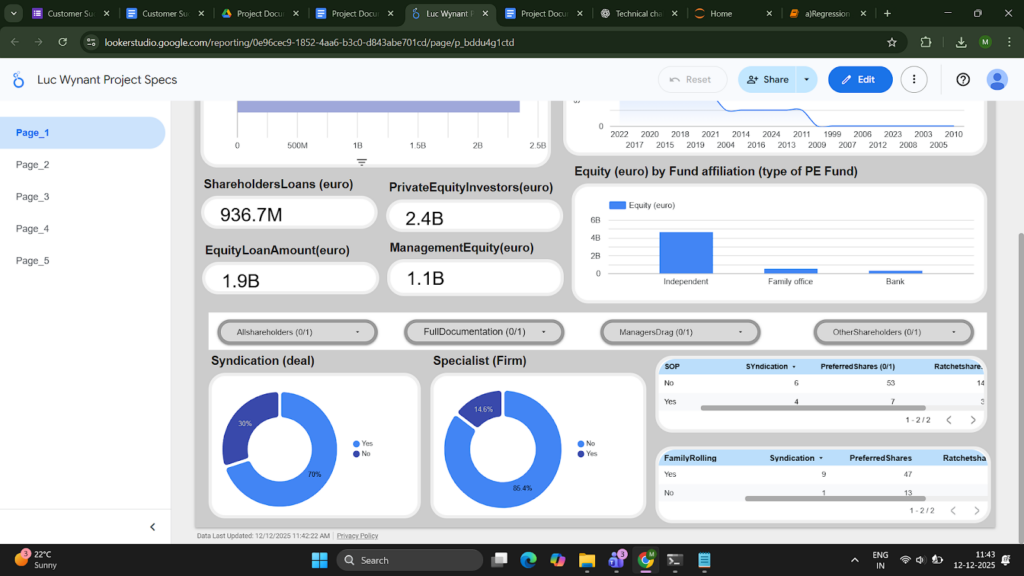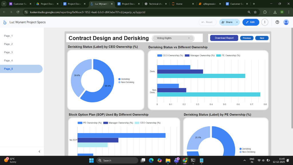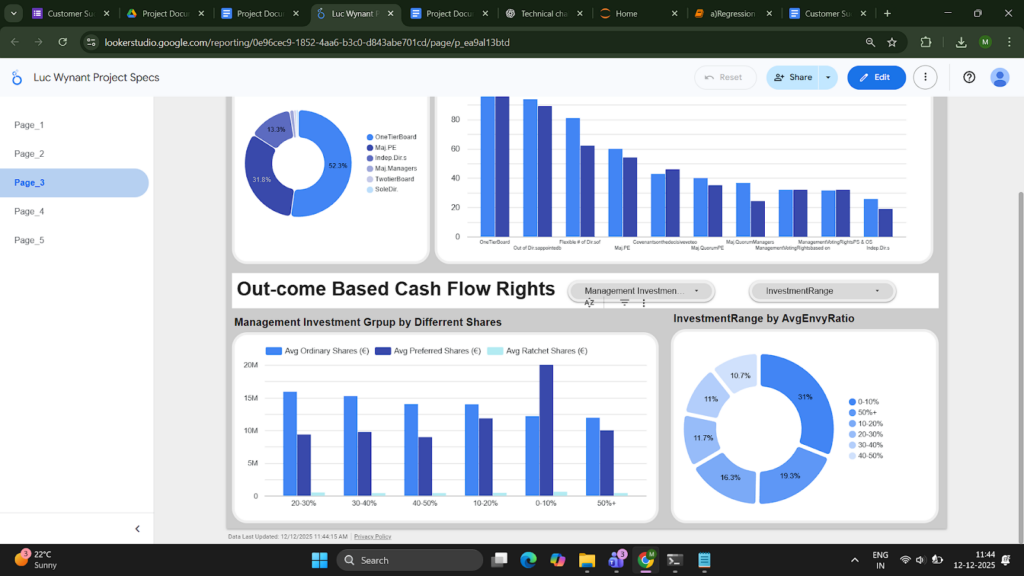 - By creating dashboards in Looker Studio, we aim to address the 10 key questions from our analysis. Each dashboard will highlight patterns in ownership, control rights, clauses, exits, and investor types. With filters and clear visuals, it will be easier to compare, explore, and understand contract designs across different deals.