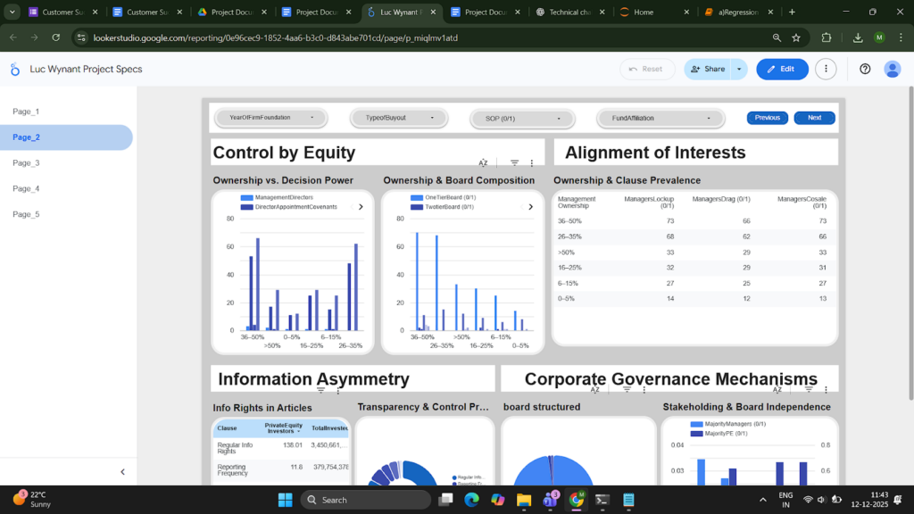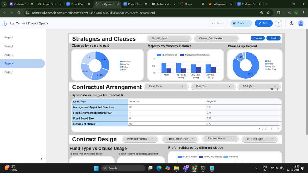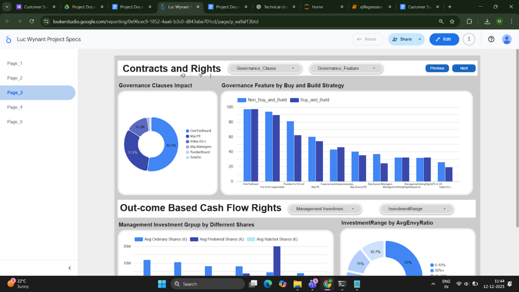 - To make the insights actionable, all findings were transformed into interactive dashboards using Looker Studio. These dashboards feature bar charts, pie charts highlighting key patterns like clause frequency, ownership splits, governance structures, and exit performance. Dashboards are grouped into themes—control rights, transparency, alignment of interests, and exit outcomes—to support focused exploration of each research question.