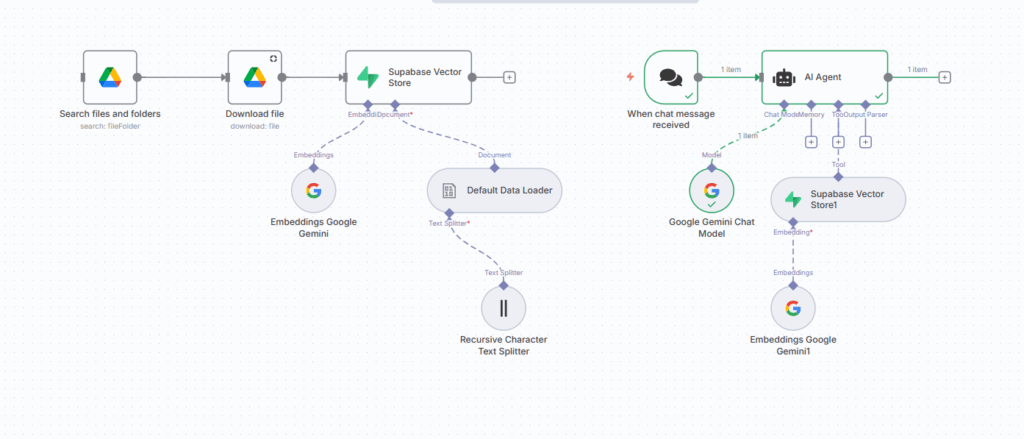 - Used Embeddings Google Gemini node – It creates the embedding vectors for the chunks.