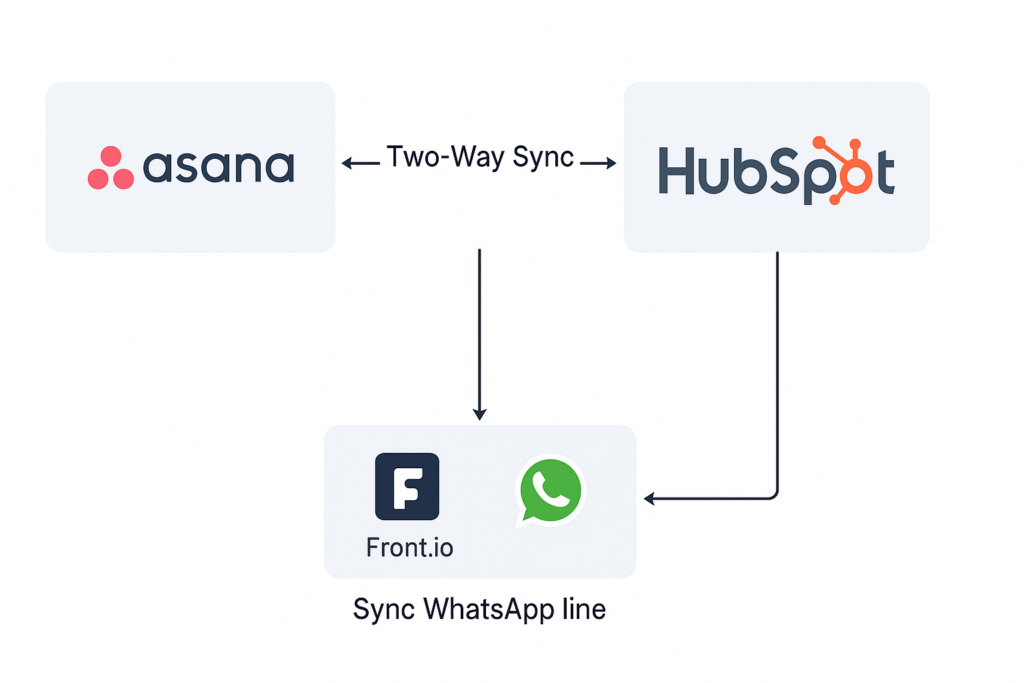 The client needed seamless integration between Asana (used for task management) and HubSpot (used for CRM and communication tracking). Manual syncing between the two platforms led to data inconsistencies and operational delays. Additionally, the client wanted to connect their WhatsApp line for centralized communication through Front.io and HubSpot.